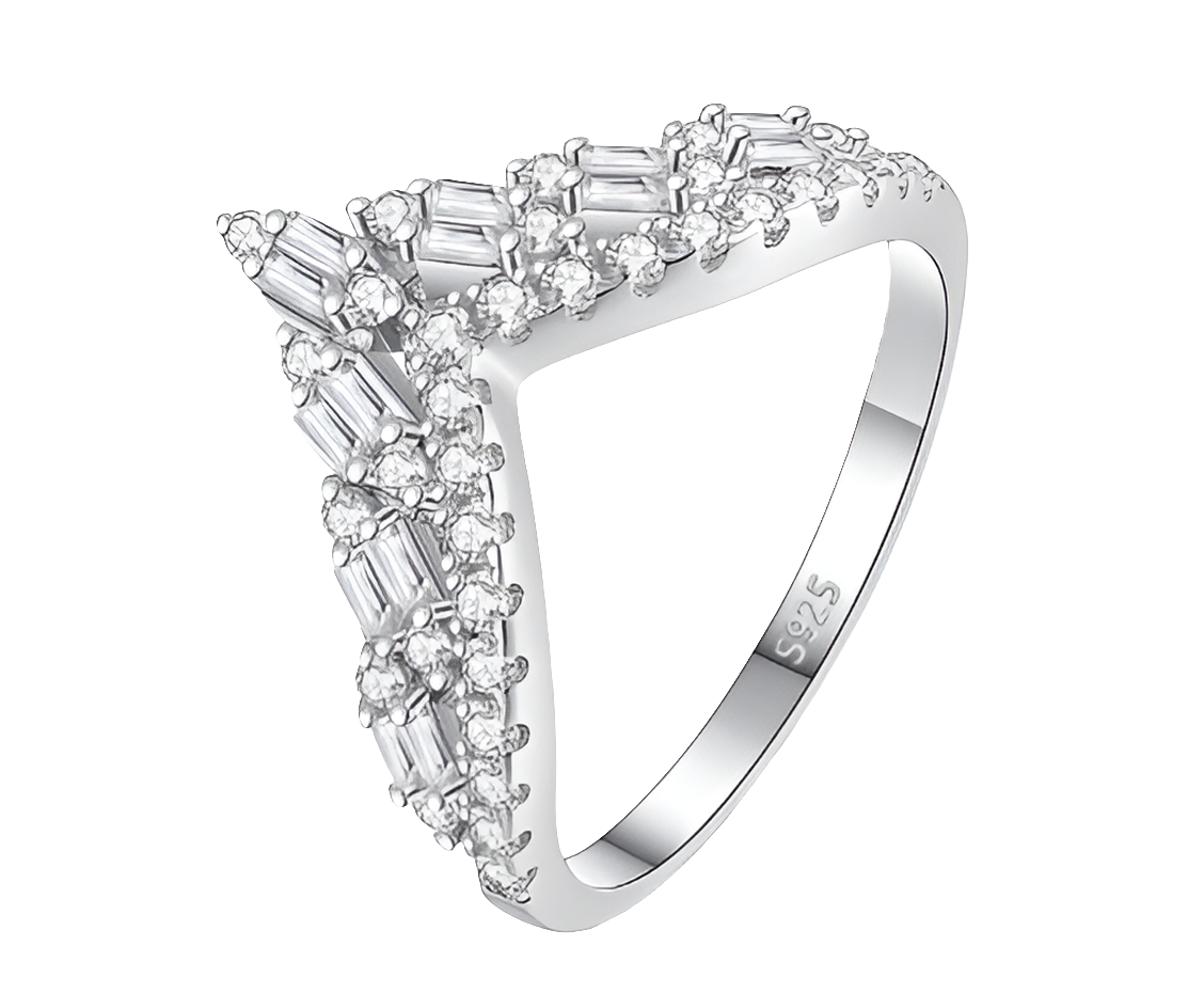 This striking ring, crafted from polished S925 sterling silver, boasts a modern, asymmetrical V-shape. It's adorned with an intricate mix of baguette and round cut cubic zircons that maximize sparkle, making it a sophisticated and versatile accessory.